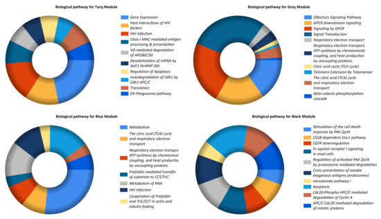 Biological pathway enrichment analysis of genes in the co-expression modules. Biological pathway enrichment analysis of the genes was performed using FunRich software.