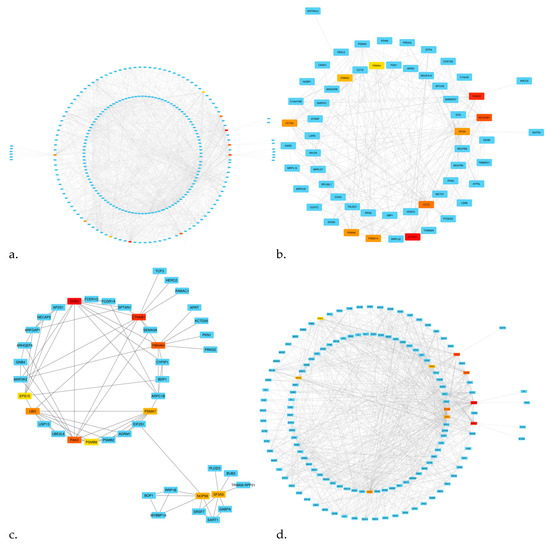(a–d) The gray, blue, black, and turquoise modules forming the PPI network. Rectangles and lines represent genes and the interactions of proteins between genes, respectively. The hub genes are colored red, orange, and yellow according to their score, from highest to lowest.