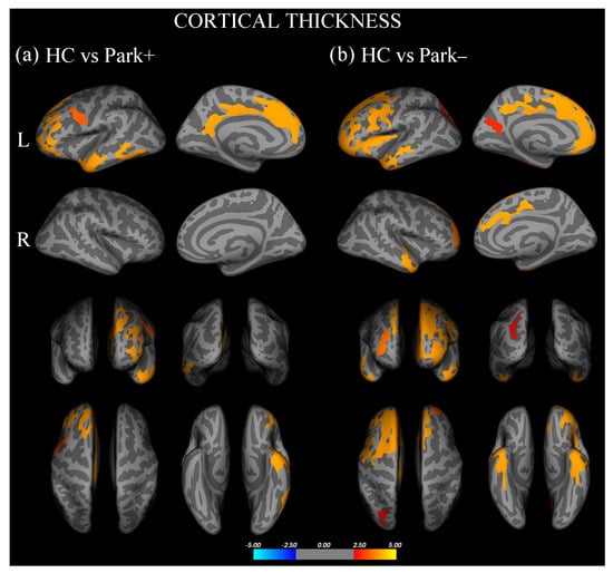 The following supporting information can be downloaded at: https://www.mdpi.com/article/10.3390/biomedicines11020522/s1, Table S1: Cortical regions displaying significant thinning in Park+ and Park− patients respect to healthy controls.