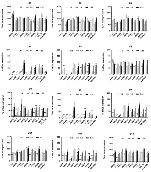 Screening of human samples for the presence of anti-AAV NAB. Human serum samples (n = 12) were screened for the presence of NAB against 10 AAV serotypes. For the initial screening, tested serum samples were used at dilutions 1:2, 1:8, and 1:32, and FBS was used as a diluent. The data are presented as a percentage of luciferase activity in the presence of the corresponding dilution of tested samples compared to the control (AAV serotype X- Luc mixed with diluent only). Each column is a mean ± SD in triplicate. Statistically significant differences are indicated as p * < 0.05, p ** < 0.01 vs. the uninhibited control for each AAV serotype.
