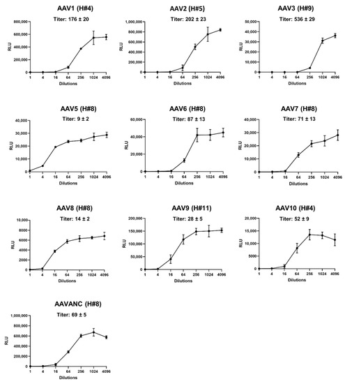 The detailed protocol has been described previously [49]. Briefly, AAV vectors of ten different serotypes expressing luciferase as a reporter gene were incubated with serial dilutions of a tested serum sample and then added to HEK293 cells pre-treated with 10 μM of Compound C (CC) (Millipore-Sigma, Billerica, MA, USA) at the same MOI of 2000 vg/cell. The infection efficiency was estimated 48 h later via luciferase activity in infected cells measured using the chemiluminescence produced by the degradation of the Bright-Glo (Promega, Madison, WI, USA) substrate. AAV NAB titers were determined as the dilution of the tested serum sample at which 50% of the chemiluminescence read off was inhibited compared to the maximum signal set at 100%, determined based on the control (AAV in the presence of the diluent only). Nonlinear regression fit was performed using Graph Pad Prism 7 software (GraphPad Software, Boston, MA, USA) to obtain the NAB titer from the saturation curve. Cells not infected with AAV were used to establish the baseline fluorescent signal). The schematic design is illustrated in Figure 1.
