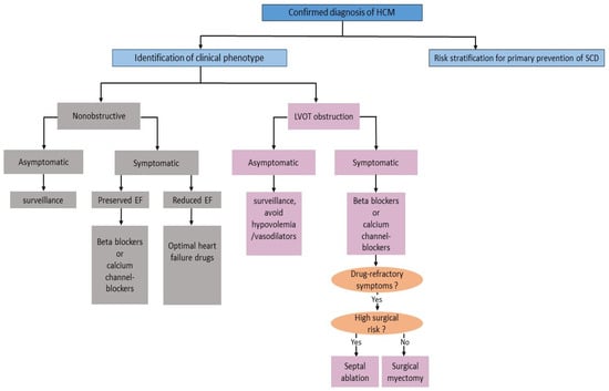 Problem-oriented management of HCM based on clinical phenotype and stage of disease. HCM: hypertrophic cardiomyopathy; SCD: sudden cardiac death; EF: ejection of fraction; LVOT: left ventricular outflow tract.