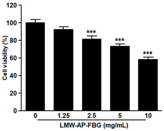 Figure 2. LMW-AP-FBG inhibits CT-26 cells viability. CT-26 cells were treated with indicated concentrations of LMW-AP-FBG for 24 h. Cell viability was determined by CCK-8 assay. Results are presented as mean ± SEM of three independent experiments for triplicate. *** p < 0.001 compared with untreated control cells (0 mg/mL).