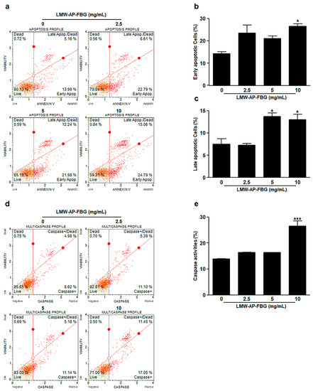 To determine if apoptosis mediated the reduction of cell viability, loss of phosphatidylserine asymmetry, a hallmark of apoptosis, was quantified by cytometry using Annexin V-stained cells. Muse™ Annexin V detection assay revealed a significant increase in early apoptosis after treatment with 10 mg/mL (26.6 ± 1.14%) of LMW-AP-FBG in comparison with treatment with the medium control (14.2 ± 0.87%) as shown in Figure 3a,b. Additionally, late apoptotic cells were dramatically increased by treatment with LMW-AP-FBG at 5 mg/mL (13.7 ± 0.81%) and 10 mg/mL (12.9 ± 1.24%) in comparison with treatment with the medium as control (7.5 ± 1.24%, Figure 3a,c). These results indicate that LMW-AP-FBG treatment can reduce cell viability via inducing apoptosis.