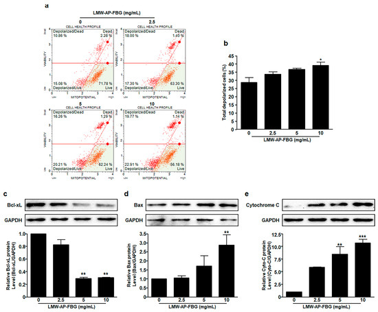 Figure 4. LMW-AP-FBG induces depolarization of mitochondrial membrane. CT-26 cells were treated with indicated concentrations of LMW-AP-FBG for 6 h. Mitochondrial membrane potential was assessed with a Muse Cell Analyzer using a Muse MitoPotential kit. (a) Typical profile plots are presented. (b) Percentage of total depolarized CT-26 cells treated with increasing doses of LMW-AP-FBG for 6 h. After cell lysis, equal amounts of proteins were separated by SDS-PAGE, transferred to PVDF membrane, and immunoblotted with antibodies against (c) Bcl-xL, (d) Bax, (e) cytochrome c, and GAPDH. Densitometric analysis was performed using ImageJ ver. 1.150i. Results are presented as mean ± SEM of three independent experiments. * p < 0.05, ** p < 0.01, *** p < 0.001 compared with untreated control cells (0 mg/mL).