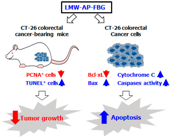 Figure 5. Schematic illustration of possible anticancer mechanisms responsible for the effects of LMW-AP-FBG against CT-26 colorectal cancer cells. CT-26 bearing mice treated with LMW-AP-FBG showed a significant decrease in PCNA-positive cells and an increase in TUNEL-positive cells in tumor tissue. CT-26 cells treated with LMW-AP-FBG showed anticancer activity by promoting apoptosis through increasing the ratio of Bax/Bcl-xl as well as activated caspase and cytosolic cytochrome c.