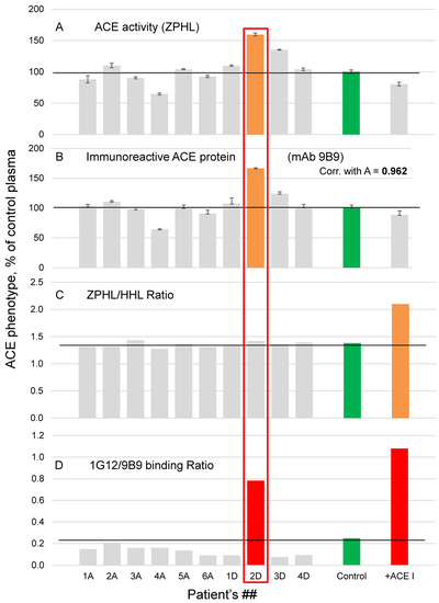 ACE phenotyping in citrated plasma samples. (A) ACE activity was measured by a spectrofluorometric assay with ZPHL (2 mM as a substrate) (B) The immunoreactive ACE protein was quantified by precipitation of ACE activity from plasma samples by mAb 9B9. (C) Ratio of the rates of the hydrolysis of two substrates, 2 mM ZPHL and 5 mM HHL (ZPHL/HHL ratio) (D) Ratio of ACE activity precipitation from plasma by mAbs 1G12 and 9B9 (1G12/9B9 ratio). Data were expressed as % of parameters of ACE phenotype from corresponding values for control pooled plasma samples from healthy controls (green bars). The same pooled plasma with 5 nM of ACE inhibitor enalaprilat was used as a positive control for the putative presence of ACE inhibitor in plasma samples. Bars highlighted with brown and red-samples with values of ACE parameters higher than 150% and 200% of controls. Bars for patient 2D are red boxed.