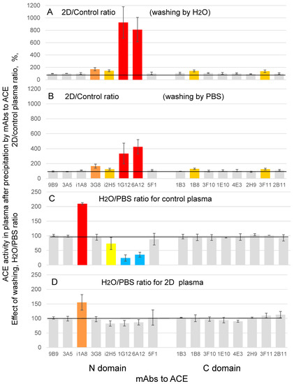 Conformational fingerprinting of blood ACE (using mAbs to ACE). (A–D) ACE activity was precipitated from plasma of donor 2D (boxed in Figure 1) and control plasma (diluted 1/5 with PBS) with 16 mAbs to different epitopes on the N and C domains of human ACE. (A,B) Data were expressed as a % of ACE activity from plasma of donor D precipitated by different mAbs from that for control plasma. Plates were washed from unbound ACE with distilled water (A) or with PBS (B). (C,D) Data are expressed as a % of ACE activity from control plasma (C) or plasma from donor 2D (D) with washing by water from that with washing by PBS. Orange bars-increase of ACE precipitation more than 20%, brown bars-more than 50%, red-more than 2-fold. Yellow bars-decrease of ACE precipitation more than 20%, blue bars-more than 50%.