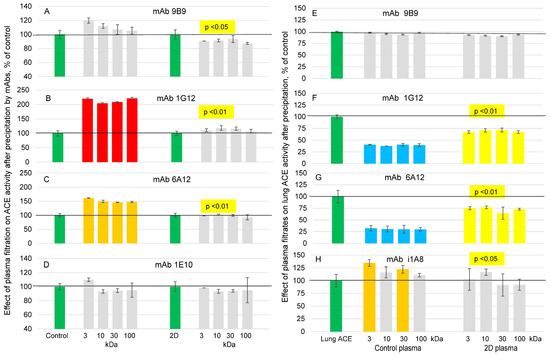 Effect of plasma filtration and filtrates on mAbs binding to ACEs. Plasma samples from donor 2D and control plasma (both 2 mL) were filtered by centrifugation through filters with 3, 10, 30, and 100 kD pores. (A–D) Plasmas were concentrated on filters 10-fold and then diluted 10-fold to return to initial volume. ACE activity precipitated from recovered plasmas by different mAbs was measured as in Figure 1 and Figure 2. Data were expressed as a % of precipitated ACE activity from that for initial non-filtrated plasmas (mean ± SD of triplicates) by each mAb. (E–H) Filtrates (at 90% concentration) were added to purified lung ACE (final ACE activity about 10 mU/mL). ACE activity precipitation by different mAbs was measured as in Figure 1 and Figure 2. Data were expressed as % (mean ± SD) of precipitated ACE activity in the presence of filtrates from that for controls (PBS instead of filtrates—green bars).