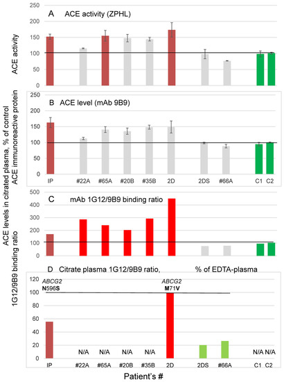 Soon after that, we found plasma sample (from unrelated patient with chronic prostatitis) also with conformationally altered ACE (Index patient IP in Figure 4). Accidentally, this patient previously ordered exome sequence of 6000+ clinically relevant genes and we found that this patient has also mutation of ABCG2, but another one, N596S, implicated in protein trafficking and stability [53,56]. ACE phenotyping of citrated plasma from all patients with conformationally altered ACE (increased 1G12/9B9 ratio) that were found in 200 unrelated plasma samples and patients with two mutations in ABCG2 are shown in Figure 4. Most of the patients with increased 1G12/9B9 ratio demonstrated also elevated level of blood ACE (Figure 4A,B), which is consistent with the hypothesis that these patients could have reduced level of bilirubin, which normally prevents an excessive ACE shedding and an appearance of extra ACE in the blood [29]. We expressed the 1G12/9B9 binding ratio in control citrated plasma as a percentage of this ratio in control EDTA plasma, where EDTA causes dissociation of zinc-ions from the active centers of ACE and, thus, reversibly inactivates the enzyme. We found that the epitope for 1G12 in citrated plasma of two control patients, 2DS and #66A, was unmasked by 20% in comparison to EDTA plasma (Figure 4D). The strikingly different results were obtained for donor 2D and Index patient: while in Index patient the epitope for mAb 1G12 in citrated plasma was unmasked by 50%, in donor 2D this epitope was completely unmasked in both citrate and EDTA plasma.