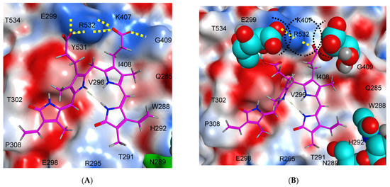 To gain additional insights on the possible binding mode of bilirubin to ACE, we docked it to the putative binding site previously identified that involved R532 on the N domain of ACE [29]. The top pose of bilirubin on the human N domain of ACE (PDB: 3NXQ) is shown in Figure 5 and Figure 6. As shown in Figure 5A, bilirubin binds to a shallow hydrophobic pocket formed by the hydrophobic residues Pro308, Ile408, and Val296 and the hydrophobic portions of the side-chains of Lys407, Tyr531, Glu299, Thr302, Glu298, Arg295, Thr291, His292, and Trp299. The two negatively charged carboxyl groups of bilirubin participate in bidentate ionic interactions with positively charged Arg532 (yellow dotted lines). In addition, one of the carboxyl groups of bilirubin forms hydrogen bond with C=O of Gly409, making the resulting binding even stronger.