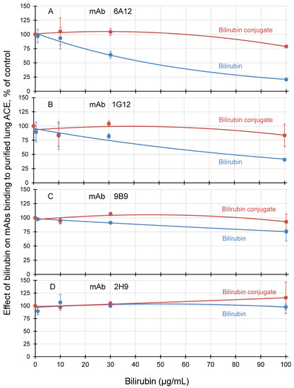 It should be emphasized that the effect of free bilirubin on mAb 6A12 (and 1G12) binding was much more pronounced than the effect of the same concentrations of conjugated bilirubin (Figure 7A,B) confirming the conclusions that free bilirubin better binds to ACE molecule.