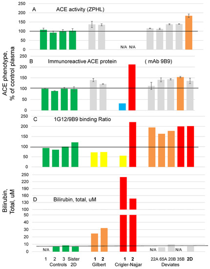For patients with Crigler-Najjar syndrome, however, the situation appeared to be equivocal. While ACE in the plasma of patient #1 with extremely high, total bilirubin was characterized by a low 1G12/9B9 ratio; the ACE in plasma of patient #2, also with high total bilirubin, unexpectedly, exhibited a high 1G12/9B9 ratio (Figure 8C,D). It is noteworthy that patients with Crigler-Najjar syndrome are characterized by much lower expression of UGT1A1 and higher extent of hyperbilirubinemia than Gilbert syndrome [48]. We could also expect higher amount of free bilirubin in plasma of these two patients than in normal plasma and plasma of patients with Gilbert syndrome and, therefore, even lower values of 1G12/9B9 ratio, as well as the decrease in blood ACE levels. It appeared to be true, but only for patient #1 (Figure 8B,C), while patient #2 demonstrated significantly elevated 1G12/9B9 ratio Figure 8C) and the level of ACE in plasma (Figure 8B). The primary hypothesis is that, despite dramatic hyperbilirubinemia, patient #2 has much lower levels of free bilirubin and thus this patient is not in a risk group for bilirubin-induced encephalopathy, because the concentration of free bilirubin in his plasma should not be high (and toxic). (Alternative explanation could be that patient #2 may have conformationally impaired ACE). The only way to clarify the reason for such differences in mAbs to ACE binding for these two patients with Crigler-Najiar syndrome is to measure free bilirubin by independent methods [64,65]. Unfortunately, none of these methods are available yet.