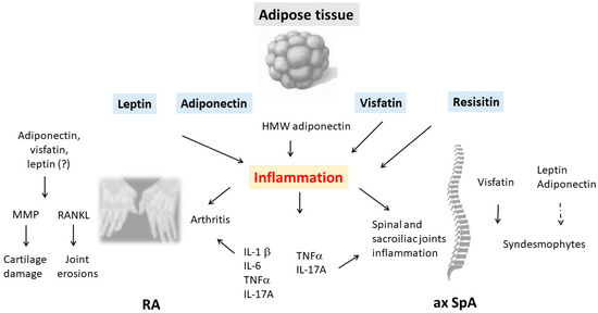 Thus, in this narrative review, we examine the role that adipokines play in structural modifications in IRDs. We focus on the most widely studied molecules in the field, i.e., leptin, adiponectin, visfatin and resistin.