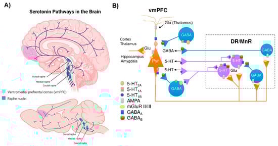 Central serotonergic pathways. (A) Schematic representation of the raphe nuclei in humans (top) and mice (bottom), which give rise to ascending projections to large regions of the brain, as well as descending projections predominantly innervate the cerebellum and its input structures and to the spinal cord. (B) Diagram showing how the ventromedial prefrontal cortex (vmPFC) and the dorsal and median raphe nuclei (DR and MrR, respectively) are anatomically and functionally connected in both directions. Pyramidal glutamatergic neurons from vmPFC send axons to raphe nuclei, where they form excitatory synapses (AMPA receptors) with 5-HT and GABAergic neurons. Stimulation of glutamatergic neurons in vmPFC primarily triggers inhibitory responses in 5-HT neurons mediated by (i) the activation of local GABAergic circuits that control the activity of 5-HT neurons in the raphe nuclei and (ii) 5-HT1A autoreceptor-dependent self-inhibitory responses following excitatory activation of 5-HT neurons. In addition, DR/MnR 5-HT neurons control the activity of glutamatergic neurons in the vmPFC through inhibitory 5-HT1A receptors and excitatory 5-HT2A receptors expressed in glutamatergic and GABAergic neurons. Similarly, the activity of the vmPFC-DR/MnR pathway may be affected by the activation of 5-HT4 receptors on glutamatergic neurons and 5-HT3 receptors on GABAergic interneurons in the outer layer of the vmPFC (not shown in the diagram). Adapted from [53,54,78].