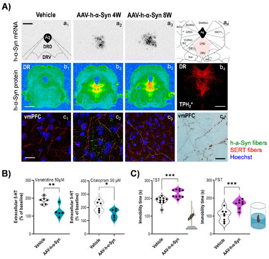 Human α-synuclein (h-α-Syn) overexpression in mouse serotonin neurons triggers a depressive-like phenotype. H-α-Syn expression was driven to raphe nuclei by a 1 μL AAV construct harboring a chicken-actin promoter (AAV-h-α-Syn) or vehicle, and mice were killed 1, 4, and 8 weeks (W) after injection. (A) Representative midbrain sections showing h-α-Syn mRNA levels in raphe nuclei examined by an in situ hybridization technique (a1–a3). Schematic coronal representation of mouse midbrain at −4.72 mm (AP coordinate) from bregma (a4). Scale bar: 500 μm. Abbreviations: Aq (aqueduct), DRD (dorsal raphe nucleus, dorsal), and DRV (dorsal raphe nucleus, ventral). Representative coronal midbrain sections showing progressive increases of h-α-Syn protein levels in the raphe nuclei assessed by immunohistochemistry procedures (b1–b3). Signal represents the optical density (OD) of autoradiograms. Scale bar: 1 mm. Raphe serotonin (5-HT) neurons were identify using tryptophan hydroxylase (TPH2) marker (b4). Scale bar: 25 μm. Representative confocal microscopy images showing serotonin transporter (SERT) and h-α-Syn axonal co-localization in different ventromedial prefrontal cortex (vmPFC) of mice injected with AAV5 examined 4 W and 8 W later (c1–c3). The majority of the h-α-Syn-positive fibers also showed SERT staining, proving that they originate from raphe nuclei. Scale bar: 25 μm. Immunohistochemistry procedure on representative coronal brain sections reveals h-α-Syn-positive axonal swellings in the vmPFC (c4). Scale bar: 25 μm. (B) Local infusion of veratridine (depolarizing agent, 50 μM) or citalopram (selective serotonin transporter inhibitor 50 μM) into vmPFC induced a greater effect on 5-HT release in vehicle-injected than in AAV-h-α-Syn-injected mice at 4 W post-administration. (C) AAV-injected mice evoked a depressive-like state in the tail suspension (TST) and forced swimming (FST) tests characterized by a longer immobility time compared to vehicle-injected mice. Values are presented as mean ± SEM. * p < 0.05, ** p < 0.01, and *** p < 0.001, compared to vehicle-injected mice. Adapted from [110].