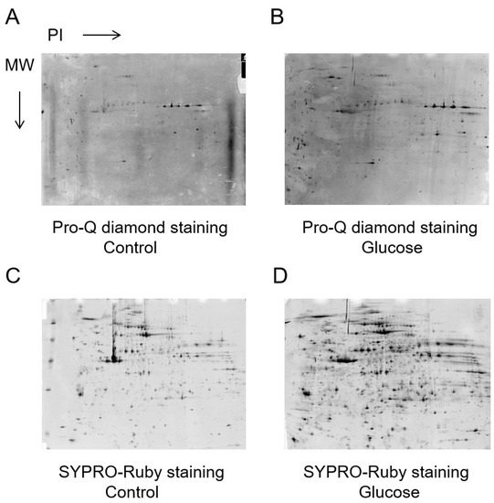 The proteins were extracted from human platelets and subjected to comparative analysis by Pro-Q Diamond staining (Figure 2A,B) and SYPRO Ruby staining (Figure 2C,D). The results showed significant differences in eight platelet phosphorylated proteins between the control and 2 h exposure to glucose, as detected by the PDQuest™ 8.0 Advanced 2D Analysis software (p < 0.05).