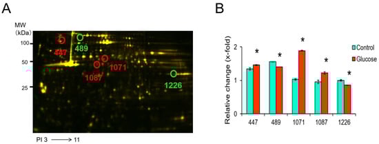 Representative 2D-DIGE image of the platelets treated with vehicle or glucose incubated for 2 h. (A) Proteins (40 μg each) were labeled with Cy3 and Cy5 dyes, mixed and subjected to 2D-DIGE analysis. (B) Spots 447, 489, 1071, 1087, and 1226 are phosphorylated proteins and their expression was significantly altered by glucose. Data are mean ± SEM of four platelet samples per group. * p < 0.05, compared with the corresponding value of the control group using the Mann–Whitney U test.