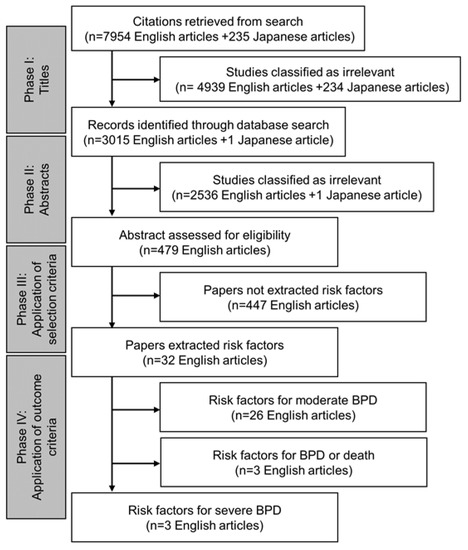 Articles that met the following eligibility criteria were included: (1) publication between January 2002 and August 2021; (2) setting of a developed country; (3) English or Japanese as the study language; (4) randomized controlled, prospective/retrospective cohort, or case-control study design; (5) extremely premature infants born before 28 weeks of gestation as study participants; and (6) endpoint of severe BPD according to the NICHD classification as an indicator of poor respiratory prognosis. Since we considered the development in the pathological evaluation and intervention/treatment methods of BPD and the change in the risk factors of BPD over the last 20 years, we only included articles published between January 2016 and August 2021. Regarding the secondary objective, we included studies that involved participants with birth weight < 1500 g or gestational age (GA) < 32 weeks and with endpoint of moderate or severe BPD according to the NICHD classification or combined results of BPD or death. The following types of articles were excluded from the review: (1) letters, editorials, commentaries, unpublished manuscripts, dissertations, government reports, books and book chapters, conference proceedings, meeting abstracts, lectures and addresses, and consensus development statements; (2) articles with <500 registered newborns; (3) articles reported by countries with United Nations Human Development Index < 0.8; and (4) animal studies.