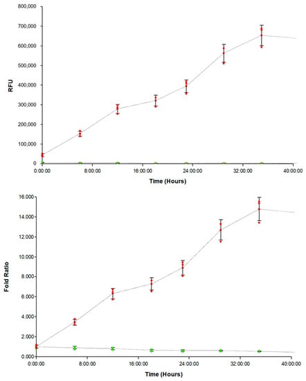 (Top) Kinetic FAM-fTHP-9 substrate signal (red) from single uninhibited U-87 test well compared with cells and no substrate (green). (Bottom) Ratio of FAM-fTHP-9 substrate signal (red) to background (green) from same uninhibited U-87 test well.