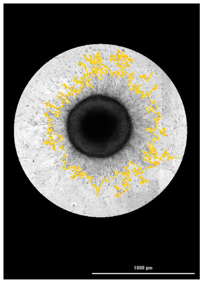 Processed U-87 spheroid invasion image with cellular analysis object mask applied.