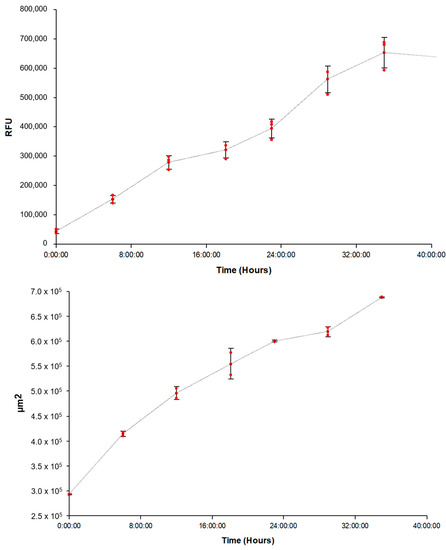 (Top) Kinetic FAM-fTHP-9 substrate signal from single uninhibited U-87 test well. (Bottom) Kinetic spheroid area coverage from same uninhibited U-87 test well.