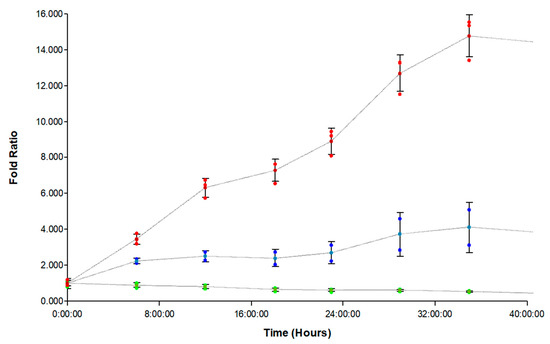 Normalized kinetic substrate signal fold ratio created by dividing signal per timepoint by signal at time 0. Red curve: uninhibited U-87 tumoroids. Blue curve: 400 µM marimastat and 4 µM aprotinin inhibited U-87 tumoroids. Green curve: U-87 tumoroids with no substrate.