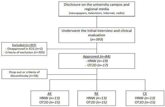 A total of 393 participants underwent the first screening. Three hundred seven were excluded or disapproved in the clinical examination which was carried out by a cardiologist and included an electrocardiogram during rest and during the effort to ensure the participants’ safety. Thirty-six participants were initially included; however, eight were excluded according to discontinuity criteria. Thus, 28 participants were included: 15 overweight individuals with T2DM (OT2D) and 13 healthy normal weight individuals (HNW) were included (Figure 1).