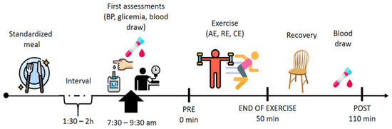 The AE, RE and CE were equalized to maintain a duration of 50 min. Another blood sample was collected 110 min after the end of the session. The sequences of assessment’s acute experimental protocols are described in Figure 2.