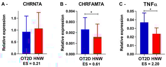 Baseline gene expression. OT2D = overweight individuals with T2DM. HNW = healthy normal weight individuals. CHRN7A n = 11 in OT2D and 19 in HNW. CHRFAM7A and TNF-α n = 45 in OT2D and 39 in HNW. * = p < 0.05 (Student’s independent t-test). ES = Effect size value.