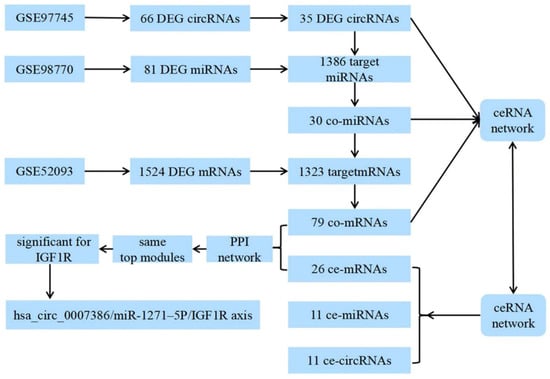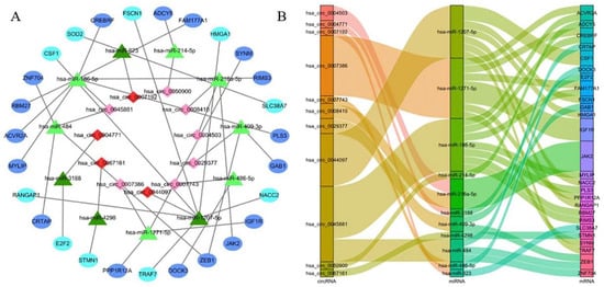 CSCD (http://gb.whu.edu.cn/CSCD/; accessed on 15 August 2022) and circBase (http://www.circbase.org/; accessed on 15 August 2022) were used to predict miRNA-binding sites (MREs), which were considered as potential target miRNAs of the DEG circRNAs. In addition, three online databases—miRDB (http://mirdb.org/; accessed on 15 August 2022), Target Scan Human (http://www.targetscan.org/vert_72/; accessed on 15 August 2022), and miRTarbase (http://mirtarbase.mbc.nctu.edu.tw/index.html; accessed on 15 August 2022)—were used to predict mRNAs that were considered potential target mRNAs of the DEG miRNAs. Co-RNAs (co-miRNAs and co-mRNAs) were identified by Venn analysis between the DEG RNAs (DEG miRNAs and DEG mRNAs) and target RNAs (target miRNAs and target mRNAs), respectively. We used a Sankey diagram to illustrate the interactions of ce-circRNAs (ceRNA-circRNAs), ce-miRNAs (ceRNA-miRNAs) and ce-mRNAs (ceRNA-mRNAs). The interactive networks of ce-circRNAs, ce-miRNAs and ce-mRNAs were established and visualized using Cytoscape 3.7.2. The diagram of ceRNA construction is shown in Figure 1.