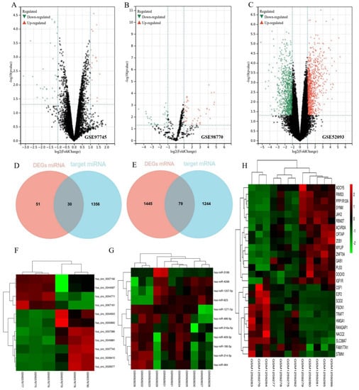 A total of 35 DEG circRNAs were selected for further study, for which a total of 1386 target miRNAs was predicted by CSCD and circBase. The target mRNAs for each of these 30 co-miRNAs were predicted using three online databases: miRDB, Target Scan Human, and miRTarbase. A total of 1323 mRNAs that appeared in all three databases were selected as target mRNAs. Finally, we chose 35 DEG circRNAs, 30 co-miRNAs, and 79 co-mRNAs for the construction of the ceRNA network. Heatmaps of these DEGs (11 ce-circRNAs, 11 ce-miRNAs, and 26 ce-mRNAs) from the ceRNA network used in hierarchy cluster analysis are shown (Figure 2F–H). The circRNA–miRNA–mRNA network is shown in Figure 3A,B.