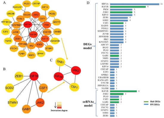 The protein–protein interaction (PPI) network constructed via the STRING database for the DEGs. (A) PPI network of the 79 co-mRNAs. (B) PPI network of the 26 ce-mRNAs. (C) The top modules networks were identified by Cytoscape MCODE. Both the 79 co-mRNA and the 26 ce-mRNA list showed the same top modules. The shades of color (yellow to red) represent the degree to which the molecules interact. (D) Genes from the DEGs (co-mRNAs and ce-mRNAs) based on the PPI network analysis with the degree of interaction in the PPI network hub nodes.
