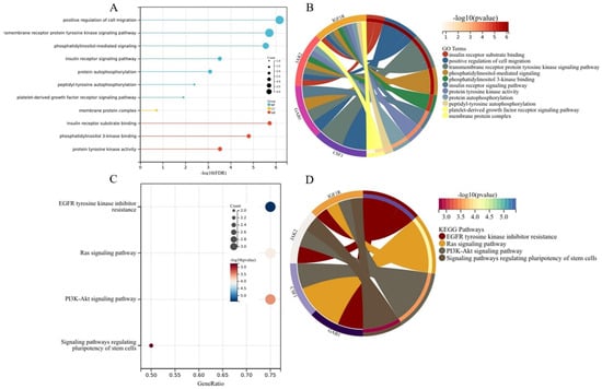 We analyzed the GO enrichment and KEGG pathways using the Cluster Profiler package in R to determine the function of the four nodes. Enrichment analyses showed that the top three terms in the biological process (BP) category included positive regulation of cell migration, platelet-derived growth factor receptor signaling pathway, and peptidyl-tyrosine autophosphorylation. The enriched terms in the cellular component (CC) category were related to the membrane protein complex. The enriched terms in the molecular function (MF) category in TAD mainly included insulin receptor substrate binding, phosphatidylinositol 3-kinase binding, and protein–tyrosine kinase activity (Figure 5A,B and Table 1). The KEGG pathway analyses of the four hub genes revealed that mRNAs were mainly involved in the Ras signaling pathway and PI3K–Akt signaling pathway (Figure 5C,D and Table 2).