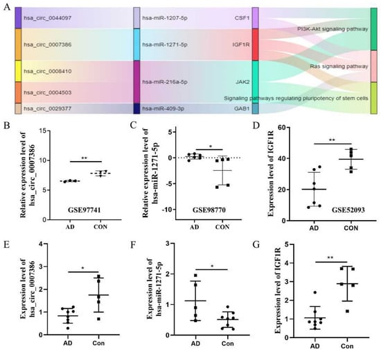 Signal axis screening and specimen verification. (A) Sankey diagram for the circRNA-microRNA-mRNA-pathways axis screened out in this study. Each rectangle represents a gene or pathway, and the connection degree of each gene is visualized based on the size of the rectangle. (B–D) The expression levels of the hsa-cic-0007386/miR-1271-5P/IGF1R between the TAD and CON group in the GSE97745, GSE98770, and GSE52093 datasets, respectively. * p < 0.05, ** p < 0.01. (E–G) The expression levels of the hsa-cic-0007386/miR-1271-5P/IGF1R between the TAD and CON group in our aortic dissection specimen. * p < 0.05, ** p < 0.01.