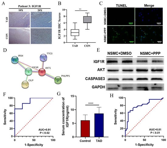 IGF1R downregulation mediates VSMC apoptosis by promoting AKT expression. (A) The expression of IGF1R protein in TAD aortic wall tissue and respective adjacent CON tissues were analyzed using IHC. (B) IGF1R expression scores are shown as box plots. (** p < 0.001). (C) Tunel stain showed PPP-induced apoptosis of NSMC. (D) STRING database shows IGF1R interaction with AKT. (E) Western blot showed that PPP-induced downregulation of IGF1R expression in NSMC further leads to the increased expression of AKT and Caspase3. (F) Receiver operating characteristic analysis of the sensitivity and specificity of the predictive value of the IGF1R in GSE52093. (G) The serum concentration of IGF1R levels between the TAD and normal patients in our data (**** p = 0.000). (H) Receiver operating characteristic analysis of the sensitivity and specificity of the predictive value of the serum concentration of IGF1R levels in our data.