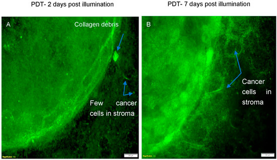 In our tumouroids, the HEY cancer cells were found to regrow and invade the stroma 7 days post-PDT treatment using TPPS2a (0.5 μg/mL) and 3 min of exposure to light (Figure 7B and Figure 8). According to the in vivo study by Schumann et al. (2015) [25] a single dose of combination therapy with the photosensitiser phthalocyanine (Pc) and siRNA as a DJ-1 gene suppressor led to a complete eradication of ovarian tumours (grown from A2780/AD cancer cells) without any evidence of recurrence in mice, whereas PDT only treated tumours began to regrow 16 days after treatment. They further explained that the ROS and heat generated after a single dose of PDT could initially produce a strong response in the tumours. They hypothesised that the further combination of the treatment with DJ-1 suppression resulted in a superior therapeutic effect, thus preventing tumour regrowth. In our in vitro study, we observed that a short time post-PDT treatment (48 h), cells within the central cancer mass diminished and cells invading the stroma were also reduced. However, incubation for an additional 5 days resulted in the regrowth of the cancer cells. This could suggest that a single dose of PDT can provide a strong response to begin with, but the cancer cells are eventually able to overcome the conditions produced by PDT as the treatment loses the effect if the additional cycles of the treatment are not provided.