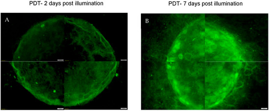 Regrowth of cancer cells in PDT-treated simple tumouroid 7 days post-treatment. The tumouroid was treated with TPPS2a (0.5 μg/mL) and 3 min of light illumination. (A) Image of a tumouroid 2 days post light illumination; (B) Image of a tumouroid 7 days post light illumination. The cells were stained with anti-cytokeratin 7 (Alexa Fluor 488) Ex/Em: 490/525 (green) conjugated antibody. The scale bar presented is 200 μm.