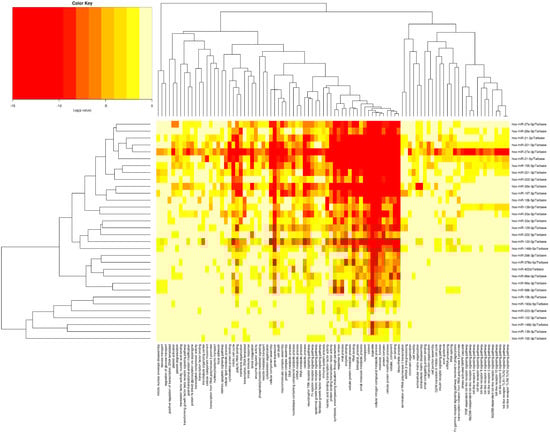Figure 3 displays the heatmap linked with gene ontology (GO) analysis of miRNAs that were upregulated at the greatest relative rate and downregulated at the lowest relative rate in our study. According to our analysis, the associated miRNAs affected 6910 and 6536 genes involved in cellular components (GO:0005575) and biological processes (GO:0008150), respectively.