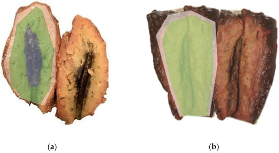 At the end of each LA procedure, the tissue was sliced along the antenna tract, revealing a cross section of the ablation zone. Ablation zones are defined by their cell viability, as correlated by vitality staining and standard H&E staining in external studies [17,18]. The central zone (black overlay in Figure 2a) is the carbonised boundary layer of charred, non-conducive tissue. The proximal zone of ablation (green overlay in Figure 2a,b) is comprised of fully ablated, non-viable tissue. The distal zone (white overlay in Figure 2a,b) has both viable and non-viable tissue. Gemeinhardt et al. also separated the zone of partial ablation into a “red zone 1”, in which vital and non-vital cells comprise a similar percentage, as well as a “red zone 2” in which cells are mostly vital [19]. All three ablation zones were measured, and their longitudinal, perpendicular and vertical diameter was recorded.