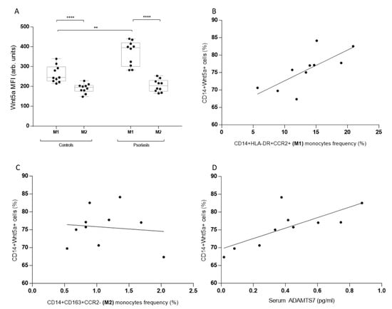 Psoriatic patients have a higher cardiovascular risk than those with inflammatory and autoimmune diseases, even in the presence of cutaneous inflammatory features. The risk is partly associated with the clinical condition and severity of the disease; however, the magnitude of the risk cannot be predicted based on this sole aspect. Even when other inflammatory factors such as circulating cytokines, acute phase proteins, or extracutaneous involvement have been included in the analysis through new adapted scores, some guidelines have recommended correcting the individual cardiovascular risk score using mathematically based strategies using multipliers in the absence of other factors that could be involved. Although chronic inflammatory factors could be participating in an accelerated atheromatosis process, further research is needed to propose new possible elements that could be participating in the early expansion of atheromatous plaque. In this study, we first set out to establish a group with the highest risk from the skin disease point of view: those without treatment for at least one year and clinically classified as having extensive disease (measured as a PASI higher than 10). By matching them by age and sex with healthy controls, we were able to differentiate more clearly which elements could be participating in the pathophysiological process of the disease and, at the same time, be part of the pathogenesis of atheromatosis. First, in a recently published study [13], our group found that ADAMTS7 is increased in psoriatic patients and that its levels are correlated with specific cytokine and inflammatory phenotyping in circulating monocytes. In the light of these findings, we went to study the group of monocytes with positivity for the glycoprotein WNT5a, a protein of the non-canonical WNT pathway. It has recently received attention for its pro-inflammatory nature and its role in cell migration, both of which are described in the joints of autoimmune diseases such as atheromatosis. Even when the effects of WNT5a on the production of cytokines, chemokines, and metalloproteinases in macrophages have been described, there is no information on its activity and correlation with the inflammatory signature in circulating monocytes before they reach the target tissue.