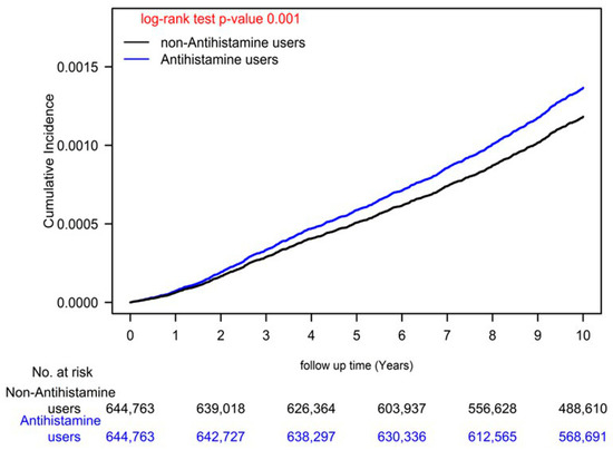 AH use was defined as the use of at least 28 cDDDs of an AH [13,15]. AHs were prescribed for the treatment of symptoms related to asthma, allergic rhinitis, medication allergies, environmental allergies, or viral infections (such as runny nose, itchy eyes, and pruritus). Information on drug type, dosage, administration route, prescription date, and total number of pills dispensed by the pharmacy was collected. Because AH use may have occurred in separate years during the study period and patients may have changed their drug use patterns over time, we treated AH use as a time-varying covariate in the Cox model. The cumulative dose of AHs was calculated by multiplying the number of pills dispensed by the prescribed dose and then dividing the result by the recorded days’ supply. The defined daily dose (DDD) of AHs, as established by the World Health Organization, was used to express dosage. The DDD is the average maintenance dose per day for a drug used for its main indication in adults. The cDDDs were calculated as the sum of the daily defined doses. AH nonuse was defined as less than 28 cDDDs to exclude occasional AH use, while AH use was defined as at least 28 cDDDs. All patients were divided into four subgroups based on quartiles of cDDDs (Table 1).
