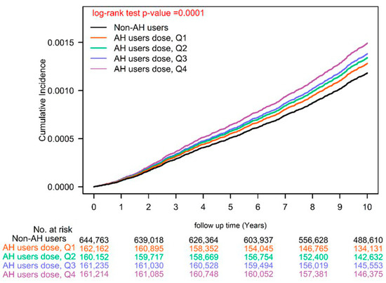 We also observed a dose–response relationship between AH use and ESCC risk: compared with AH nonuse (<28 cDDDs), the aHRs for AH use at 28–182, 183–488, 489–1043, and >1043 cDDDs were 1.12, 1.20, 1.25, and 1.37, respectively. Our Kaplan–Meier analysis showed that ESCC risk was higher in AH users than in AH nonusers (Figure 1; log-rank test, p = 0.001). Even after stratifying the patients by AH cDDDs, a similar trend was observed (Figure 2; log-rank test, p = 0.001).