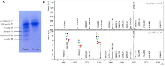 To exclude diabetes mellitus (DM) as a secondary cause of aberrant Tf glycoprofile, additional IEF Tf was performed on samples from eight other hyperglycemic DM patients; however, the Tf profiles of all of them were within the reference intervals for negative controls (data not shown). The abnormal N-glycoprofile, with significant changes in the abundance of hypogalactosylated N-glycans, is caused by insufficient transport of UDP-galactose from the cytoplasm to the Golgi, where it serves as a glycosyl donor for the synthesis of the complex glycans. The presence of galactose-deficient glycans, identified by MS, has already been described in Witters et al., 2020, where they studied galactose supplementation in SLC35A2-CDG patients. Their work described the same glycoprofile pattern which lacked galactose and had increased levels of hypogalactosylated glycans—Hex3HexNAc4, Hex4HexAc4, and Hex4HexNAc4NeuAc1 []. In the serum sample of the presented patient, we identified additional abnormal agalactosylated N-glycans (Hex3HexNAc5 and Hex3HexNAc5Fuc1) that can be included in the panel of serum glycobiomarkers for SLC35A2-CDG.