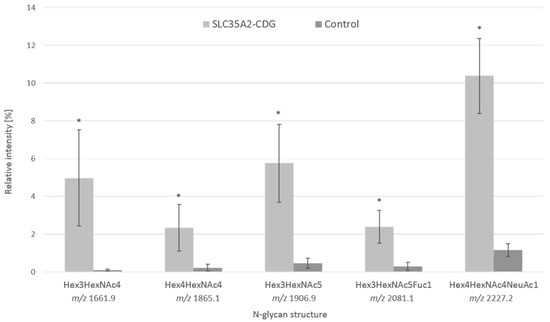 For the MS analysis, 3 technical replicates from the serum of the patient and 5 individual negative controls (biological replicates) were used. The presented data were calculated from the relative intensities of the sum of total identified N-glycans. Relative intensities of single N-glycan structures were calculated from the average values of the replicates. Relative standard deviations were calculated. A one-tailed paired t-test (α = 0.05) was applied to evaluate the changes in the levels of aberrant hypogalactosylated N-glycans.