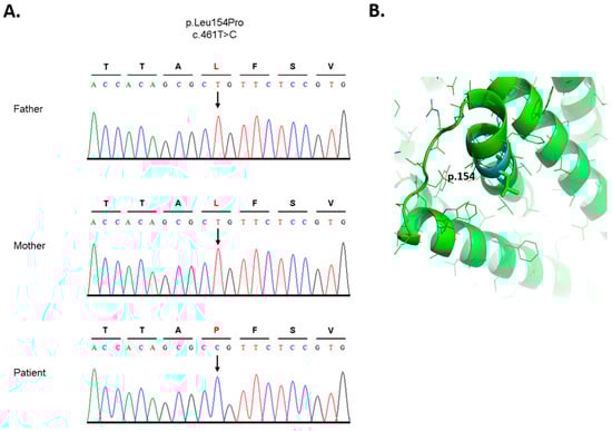 (A) Sanger sequencing analysis of the SLC35A2-CDG patient and his parents. Representative sequence chromatograms of unaffected parents and the patient are shown. The protein and cDNA annotations of the identified new variant are shown above. The arrow shows the position of nucleotide exchange of a new variant. (B) Tertiary SLC35A2 protein structure. P.154 amino acid selected for in silico mutagenesis p.Leu154Pro and indicated in different colors (atoms are color-coded), leucine—green, superimposed proline—cyan.