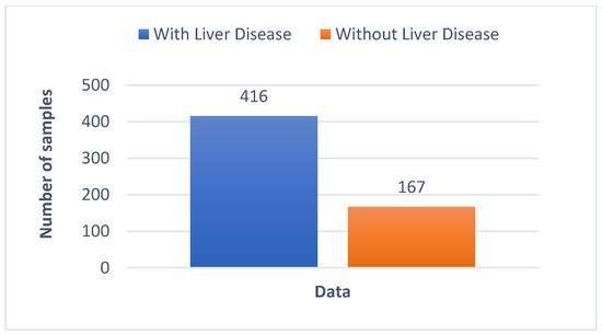 The UCI machine learning repository’s Indian Liver Patient Dataset (ILPD) is used to perform liver disease classification. [23]. It contains 11 columns that have 10 features and a target variable. The features are age, gender, total bilirubin (TB), direct bilirubin (DB), total proteins (TP), albumin (ALB), albumin and globulin ratio (A/G), alamine aminotransferase (SGPT), aspartate aminotransferase (SGOT), and alkaline phosphotase (Alkphos). The characteristics of all the features for the patients are tabulated in Table 1. The output variable has two classes denoting patients with liver disease and those without. The dataset contains 583 records of patients collected from Andhra Pradesh’s North East region in India. The distribution of patients with and without liver disease is shown in Figure 1.