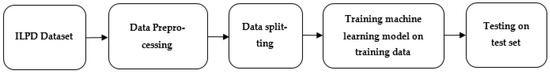 In this subsection, the methodology used to classify liver and non-liver diseases is discussed. The dataset is first preprocessed using various techniques. The dataset is then split into training and test sets in order to train and assess the machine learning models. Machine learning models are trained on the created training set in order to classify the liver disease. The trained model is then tested on the test set and its performance is assessed using various metrics. The architecture of the above method is illustrated in Figure 2.
