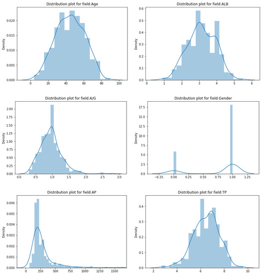 Distribution curves can be plotted to check whether the data is skewed or not. When the distribution curve of the data is distorted towards either the left or right side, then it is said to be skewed. Skewed data can affect performance by violating model assumptions or by affecting the interpretation of feature importances [25]. In the ILPD dataset, the features that are skewed are: ‘A/G’, ‘TB’, ‘AP’, ‘SGPT’, ‘DB’, and ‘SGOT’. There are various transformations available for handling the skewed data, but in this work, the ‘log1p’ transformation is used. It effectively helps to balance the distribution of the curve. The formula used for the ‘log1p’ transformation is given below Equation (1). The skewness of columns can be observed in Figure 4.