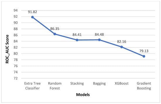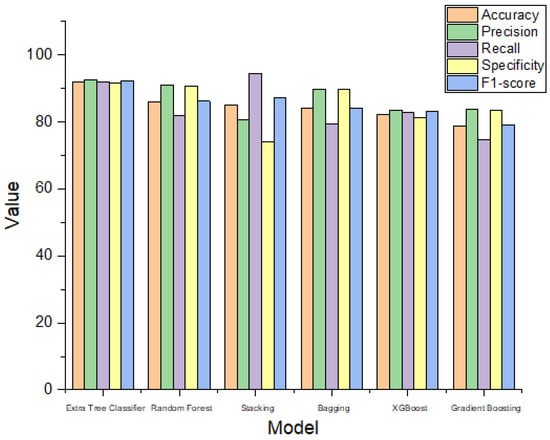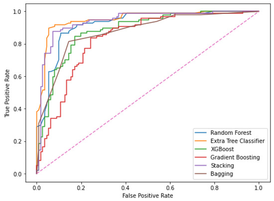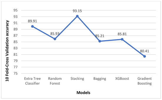 The results obtained for the liver disease classification on the ILPD dataset using various machine learning models have been illustrated above in Table 3 and Table 4. The uncertainty in the model has been represented in terms of confidence interval (CI) using bootstrapping in Table 3. The comparison graphs of these models for different metrics can be seen in Figure 5. The results shown above in Table 3 and Table 4 are obtained after applying enhanced preprocessing techniques on all the models. The receiver operating characteristic (ROC) curves have been plotted in Figure 6. According to that combination of feature selection, feature scaling preprocessing techniques with imputation and data balancing were used. The preprocessed data were finally trained and tested on all the six models. The results obtained uses the evaluation metrics such as accuracy, precision, recall, specificity, F1-score, ROC–AUC, and 10-fold cross validation. The graphs for ROC–AUC and 10-fold cross validation are given in Figure 7 and Figure 8, respectively. Among them, extra tree classifier had the highest testing accuracy of 91.82% followed by random forest with an accuracy of 86.06%. Gradient boosting had the lowest accuracy. When the models were tested with 10-fold, the cross validation stacking model had the highest accuracy of 93.15% and lowest accuracy of 80.41% for the gradient boosting model. When all the metrics are taken into consideration, the extra tree classifier shows the best performance, whereas the gradient boosting shows the worst.
